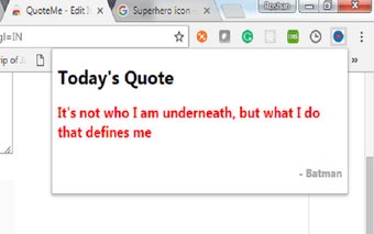 QuoteMe adalah ekstensi browser gratis yang tersedia di Chrome yang bertujuan untuk memberikan sentuhan inspirasi pada pengalaman menjelajah Anda. Ekstensi ini memberikan pengguna dosis harian kutipan Super Hero untuk mencerahkan hari mereka. Dengan terintegrasi dengan lancar ke dalam browser Chrome, QuoteMe menawarkan cara sederhana untuk tetap termotivasi dan terhibur saat menjelajah web.